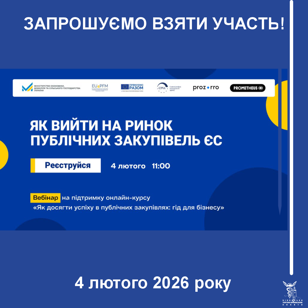 Принагідно запрошуємо взяти участь у черговому вебінарі, який відбудеться 4 лютого 2026 року об 11 годині та охопить питання виходу українських компаній на ринок публічних закупівель ЄС.
