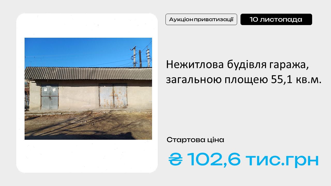 Найменування об’єкта приватизації: нежитлова будівля гаража, загальною площею 55,1 кв.м.